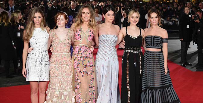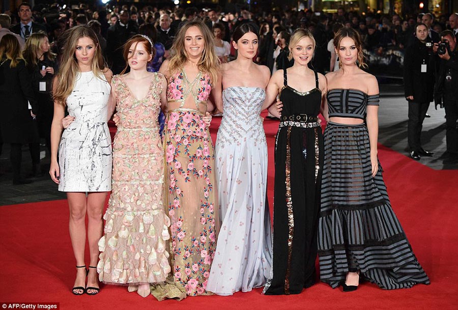 ลิลลี่ เจมส์ สาวหวานดั่งเจ้าหญิงขวัญใจแฟนๆ จาก Cinderella ในชุดเดรสเปิดไหล่สีเทาดำของแบรนด์ เออร์เด็ม (Erdem) ที่ได้รับแรงบันดาลใจด้านการออกแบบมาจากในยุคสมัยวิคตอเรียน ตามมาด้วย
