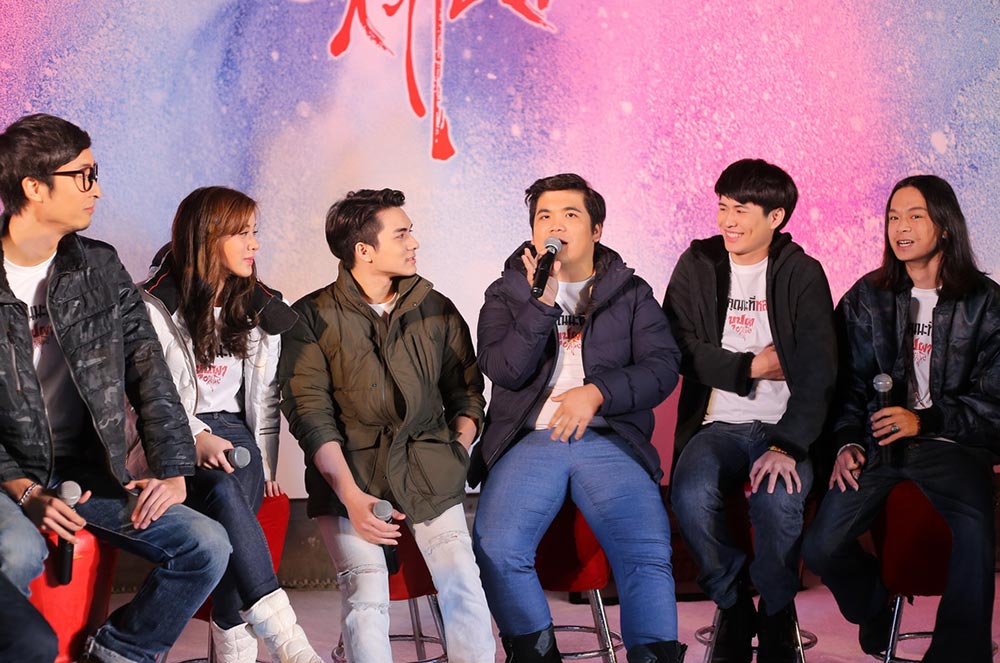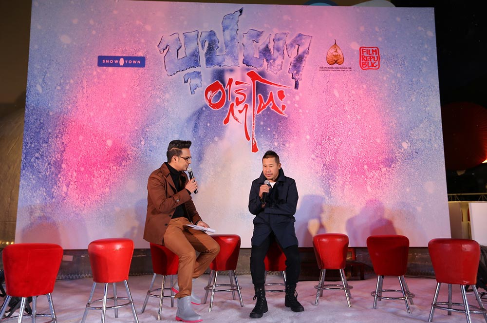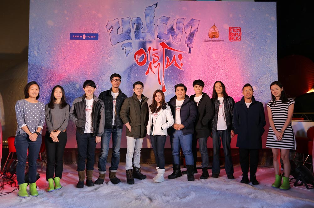 คุณชมศจี เตชะรัตนประเสริฐ รองประธานกรรมการฝ่ายขาย จากบริษัทสหมงคลฟิล์ม อินเตอร์เนชั่นแนล ขึ้นถ่ายรูปพร้อมผู้กำกับและนักแสดง