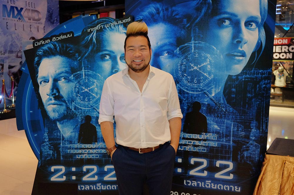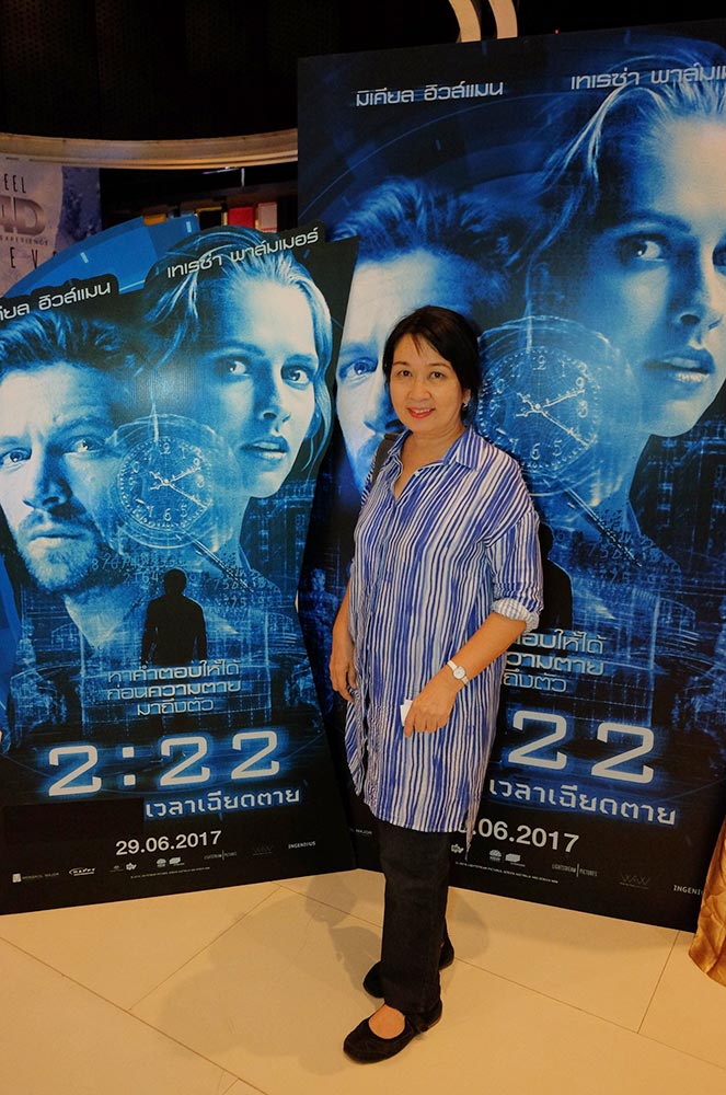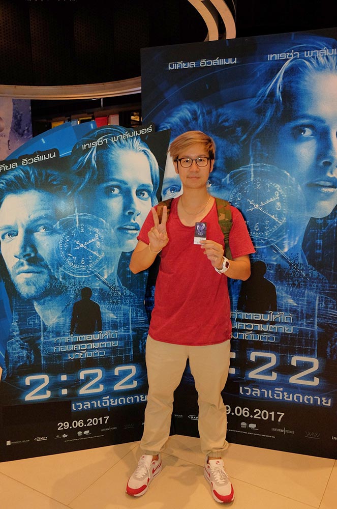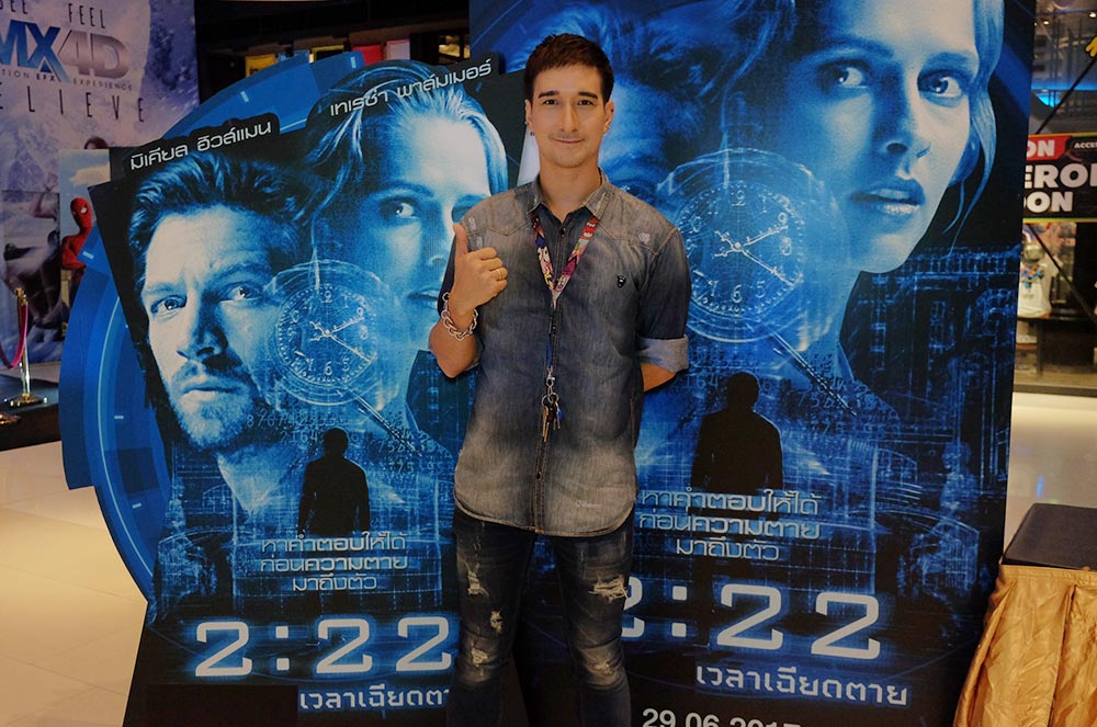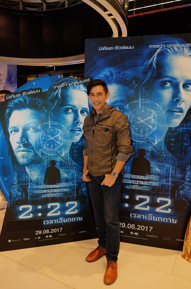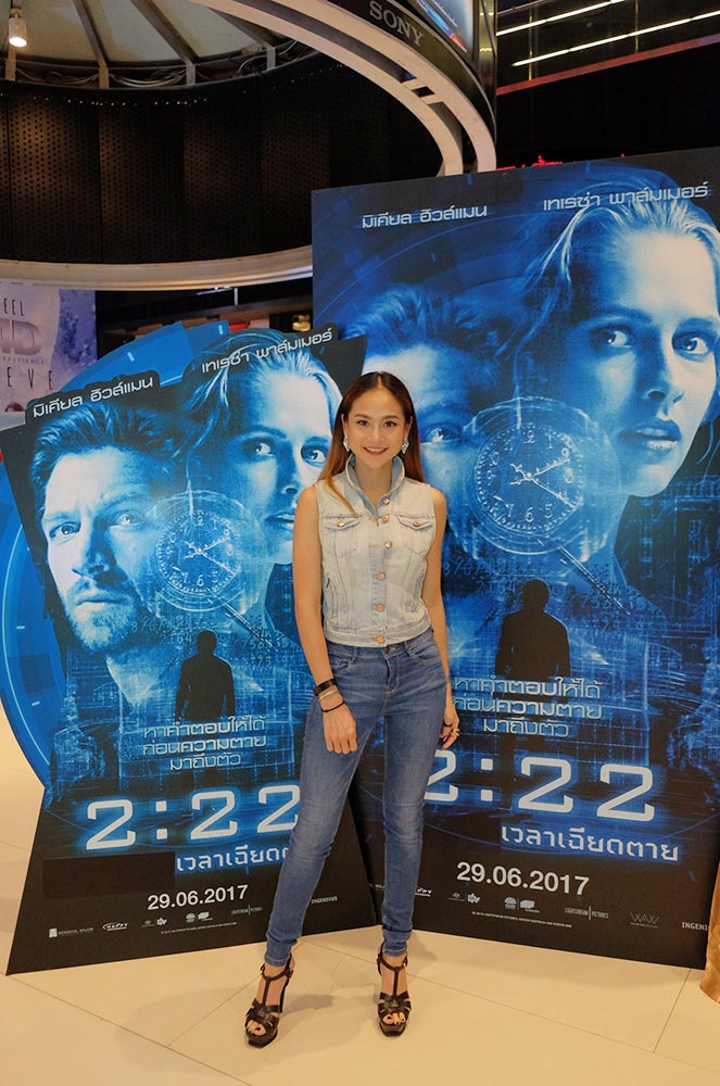 2:22 - เวลาเฉียดตาย ภาพยนตร์ทริลเลอร์-โรแมนติก ไอเดียล้ำที่จะพาผู้ชมร่วมไขปริศนาที่มีห้วงเวลาขีดเส้นตายชีวิต!! เมื่อวันที่ 28 มิถุนายน 2560 ณ โรงภาพยนตร์ SF World Cinema ชั้น 7 ศูนย์การค้าเซ็นทรัลเวิลด์ ภายในงานมีสื่อมวลชน และแขกผู้มีเกียรติ ดารานักแสดงมาร่วมงานมากมาย อาทิ