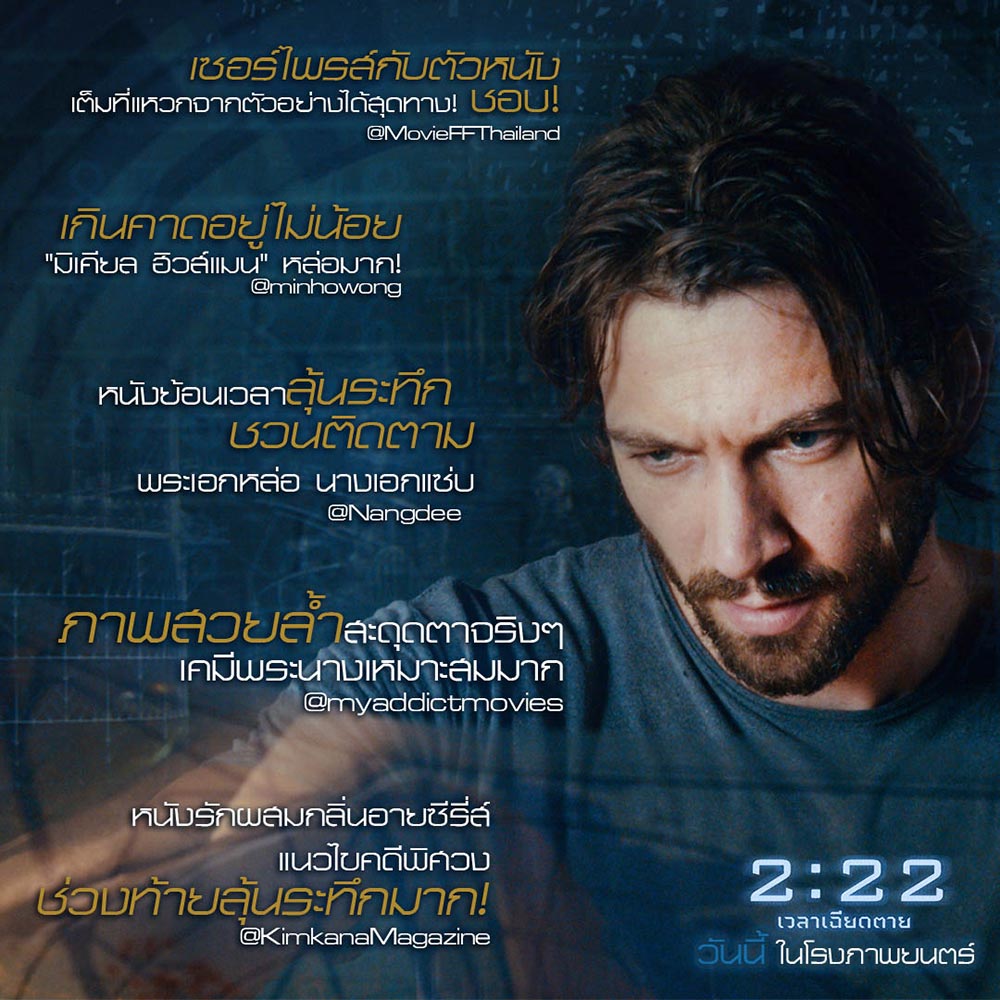 "หนังสนุก ลุ้นตลอดที่เวลา 2:22 จะเป็นยังไง พระนางเคมีเข้ากันดี หล่อเซอร์กะสาวสวย หวานมากเหมือนหนังรักโรแมนติก" - อินกะหนัง @myinnermovie