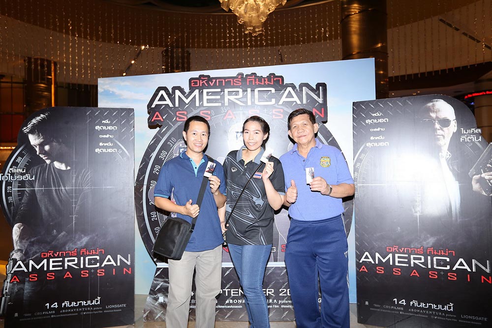 ประเทศสิงคโปร์ ร.ท. อดิศักดิ์ สาลีโนศักดิ์ นักกีฬายิงปืนทีมชาติประเภทปืนสั้นอัดลมชาย เจ้าของเหรียญทองแดงกีฬาซีเกมส์ครั้งที่ 25 คุณหยดเทียน ประทุมทอง นักกีฬามือปืนทีมชาติไทยประเภทปืนยาวอัดลมหญิงที่ผ่านการแข่งขันซีเกมส์ครั้งล่าสุดที่ประเทศมาเลเซียสด ๆ ร้อน ๆ และคุณลักษิกา ศรีนิติวรวงศ์ นักยิงปืนทีมชาติประเภทปืนสั้นอัดลมสตรี เจ้าของเหรียญเงินการแข่งขันเวิลด์ คัพ จูเนียร์ พร้อมด้วยทีมนักกีฬายิงปืนจากสมาคมนักกีฬายิงปืนแห่งประเทศไทย ชมรมกีฬายิงปืนกองพันทหารม้าที่ 4 รักษาพระองค์ ชมรมครูฝึกยิงปืน ชมรมยิงปืน Biker Shooting Club มาร่วมกันชมภาพยนตร์รอบพิเศษ American Assassin รอบรวมพลมือปืน ที่โรงภาพยนตร์พารากอน ซีนีเพล็กซ์ เมื่อคืนวันที่ 13 กันยายนที่ผ่านมา นับได้ว่าเป็นการรวมตัวของพลพรรคผู้ที่หลงใหลในกีฬายิงปืนที่ยกทีมมาร่วมชมภาพยนตร์พร้อมหน้าพร้อมตามากที่สุดครั้งหนึ่งของเมืองไทย