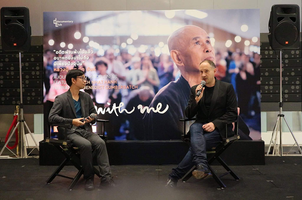 "Q&A กับ Max Pugh ผู้กำกับภาพยนตร์ Walk With Me" ซึ่งจะเป็นการพูดถึงที่มาของภาพยนตร์เรื่องนี้ในมุมของผู้กำกับ และพูดคุยถึงเบื้องหลังการถ่ายทำ ท่ามกลางสื่อมวลชนและผู้ที่สนใจก็ยังมาร่วมงานกันอย่างคับคั่งเช่นเดิม โดยทางคุณ Max Pugh ก็บอกเล่าถึงการถ่ายทำด้วยระยะเวลาที่ยาวนานถึง 3 ปี ที่เต็มเปี่ยมไปด้วยความประทับใจ ต่อหลวงปู่ ติช นัท ฮันห์ และ เหล่านักบวชที่ได้รับคำอนุญาตอย่างเป็นทางการให้เข้าถึงทุกอิริยาบถแห่งวิถีเจริญสติในหมู่บ้านพลัม ประเทศฝรั่งเศส ว่าเป็นอย่างไร รวมถึงการที่ได้ดาราชื่อดังอย่าง เบเนดิกต์ คัมเบอร์แบตช์ (Benedict Cumberbatch) ซึ่งที่มาคิวทองมาก มาร่วมสรรค์สร้างโดยให้เสียงบรรยาย ภาพยนต์สารคดีเรื่องนี้ทั้งเรื่องเลยทีเดียว