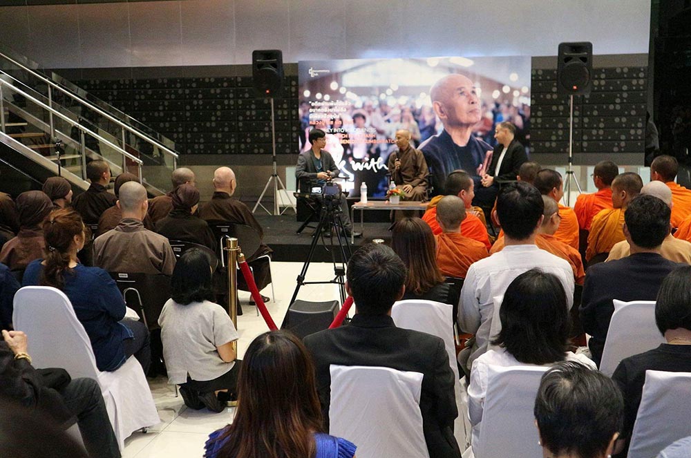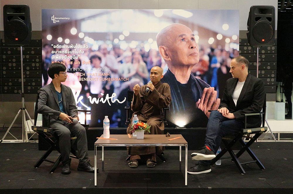 ภิกษุฟับเนียม และคุณ Max Pugh ผู้กำกับ มาร่วมพูดคุย ท่ามกลางผู้ที่มาร่วมฟัง ทั้งที่เป็นแฟนประจำของ Documentary Club และผู้ที่สนใจเรื่องราวของ หลวงปู่ ติช นัท ฮันห์ ต่างมาร่วมงานกันอย่างคับคั่ง อาทิ ภิกษุสงฆ์, ภิกษุณี และพุทธศาสนิกชนทั่วไป หลังจบการเสวนาก็ได้มีการร่วมเดินกรรมฐานเข้าสู่งโรงภาพยนตร์เพื่อรับชมภาพยนตร์เรื่อง