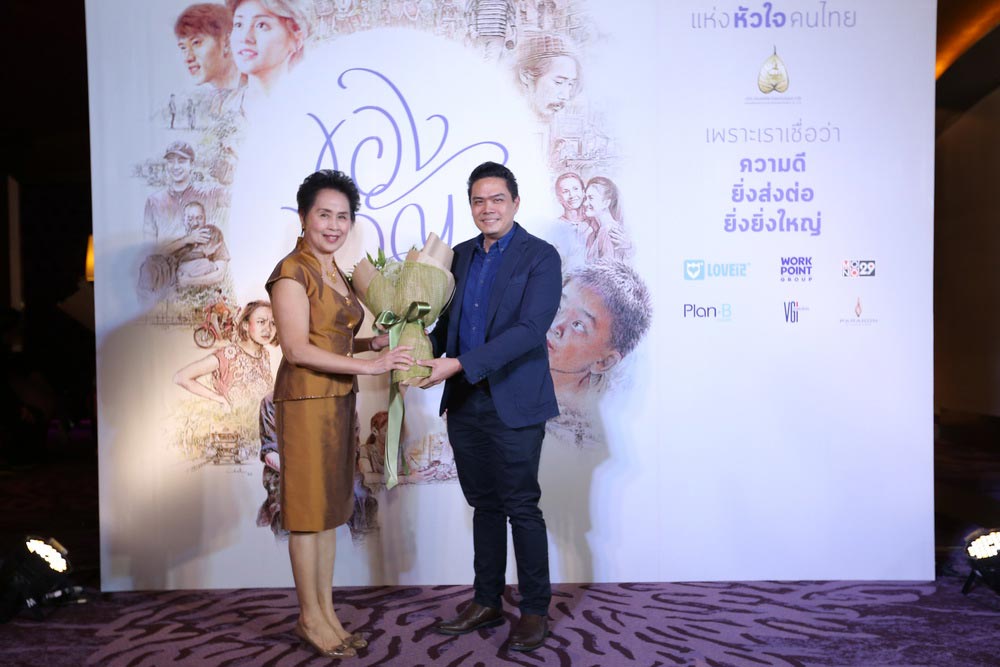 จากนั้นจึงเชิญ คุณเตือนใจ เตชะรัตนประเสริฐ รองประธานกรรมการ บริษัท สหมงคลฟิล์ม อินเตอร์เนชั่นแนล จำกัด ขึ้นมามอบช่อดอกไม้ให้กับเหล่าพาร์ตเนอร์คนสำคัญที่ได้มอบความร่วมมืออย่างเต็มที่ในการส่งต่อของขวัญชิ้นพิเศษนี้ ดังนี้ คุณพาณิชย์ สดสี ประธานเจ้าหน้าที่บริหารกลุ่ม GROUP CEO บริษัท เวิร์คพอยท์ เอนเตอร์ เทนเมนท์ จำกัด (มหาชน), คุณบรรณสิทธิ์ รักวงษ์ ผู้อำนวยการสถานีโทรทัศน์ดิจิตอล ช่อง MONO29 บริษัท โมโน บรอดคาซท์ จำกัด, คุณอัฐมาศ เข็มกลัด VIice President Office บริษัท แพลน บี มีเดีย จำกัด (มหาชน), คุณวิชัย กุลธวัชชัย ผู้จัดการอาวุโสฝ่ายการตลาด บริษัท เมเจอร์ ซีนีเพล็กซ์ กรุ้ป จำกัด (มหาชน) รวมทั้งกล่าวขอบคุณพาร์ทเนอร์สำคัญ อย่าง คุณบอย โกสิยพงษ์ โปรดิวเซอร์และนักแต่งเพลงบริษัท LOVEiS ผู้อยู่เบื้องหลังเพลง
