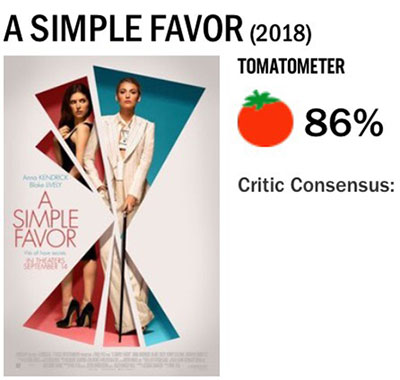 “A Simple Favor” ยังเปิดตัวแรง! กวาดคำชมแบบ #FRESH สุด ๆ จากบรรดานักวิจารณ์ชั้นนำทั้ง “เป็น Gone Girl ที่เจ็บแสบและมีสไตล์” – ET / “หักมุมเหนือชั้น มีสไตล์” – Entertainment Weekly / “บันเทิงเว่อร์” – Indiewire เรียกได้ว่าโกยคะแนน Rotten Tomatoes พุ่งไปถึง 86% กันเลยทีเดียว นั่งแท่นภาพยนตร์ที่คอหนังทั่วโลกไม่ควรพลาด!