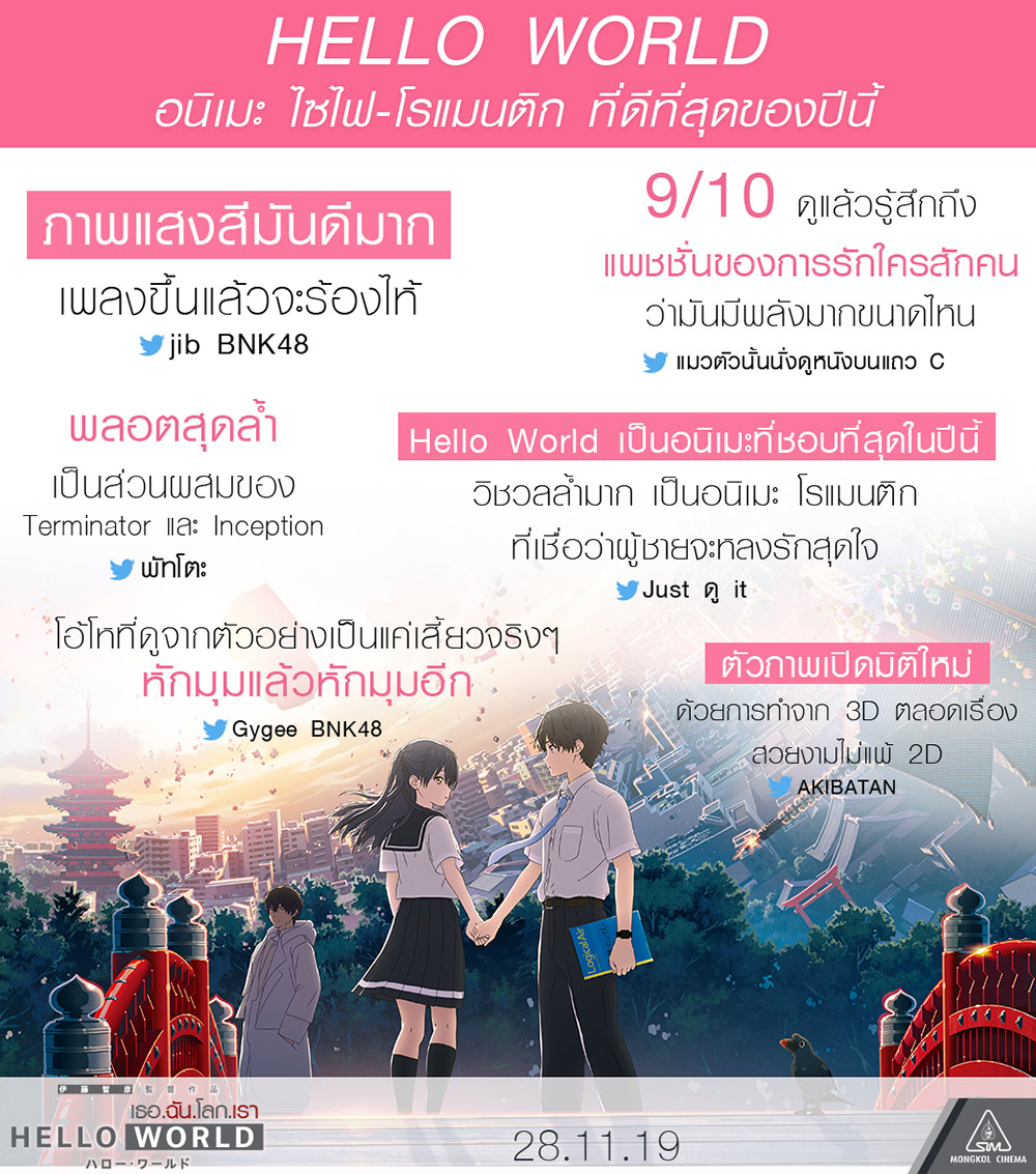 "Hello World เป็นอนิเมะที่ชอบที่สุดในปีนี้ วิชวลล้ำมาก เป็นอนิเมะโรแมนติกที่เชื่อว่าผู้ชายจะหลงรักสุดใจ" - Just ดู it